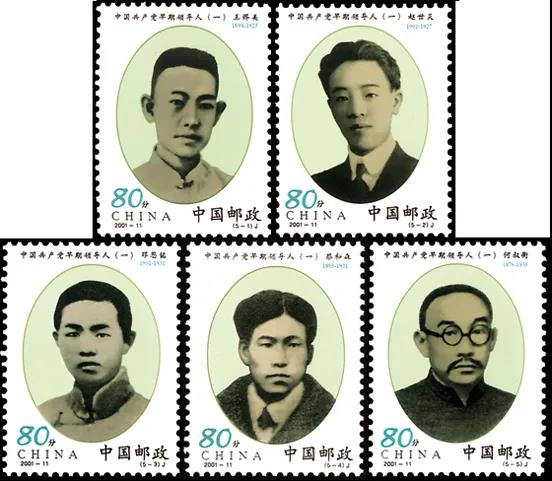 中國(guó)共產(chǎn)黨早期組織的創(chuàng)建者和早期領(lǐng)導(dǎo)人王盡美、趙世炎、鄧恩銘、蔡和森、何叔衡,就是這些千千萬(wàn)萬(wàn)個(gè)共產(chǎn)黨員中的杰出代表。為深切緬懷這些革命先驅(qū)者的光輝業(yè)績(jī),學(xué)習(xí)繼承和發(fā)揚(yáng)他們的崇高精神,國(guó)家郵政局特于2001年6月28日發(fā)行了《中國(guó)共產(chǎn)黨早期領(lǐng)導(dǎo)人(一)》郵票一套5枚。