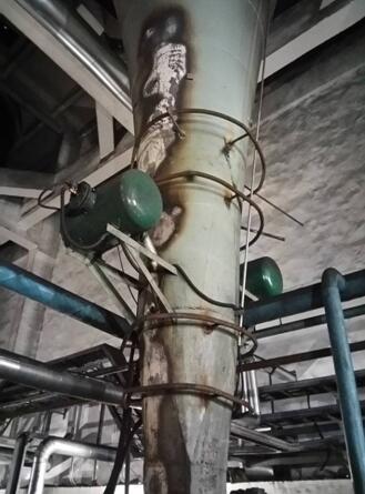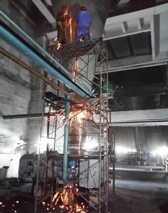 為了不影響正常的運行,該廠采用了空氣炮、氣旋管、人工疏松等辦法進(jìn)行處理,但是收效甚微,直至今日空氣炮儼然成為了雞肋,為了保證安全運行鍋爐運行人員必須每班安排專人進(jìn)行維護(hù),大量消耗了人力與物力。為解決煤倉堵煤、棚煤問題,該廠決定在十臺煤倉上安裝我公司煤倉疏松機(jī),下圖為現(xiàn)場施工人員安裝我公司煤倉疏松裝置。